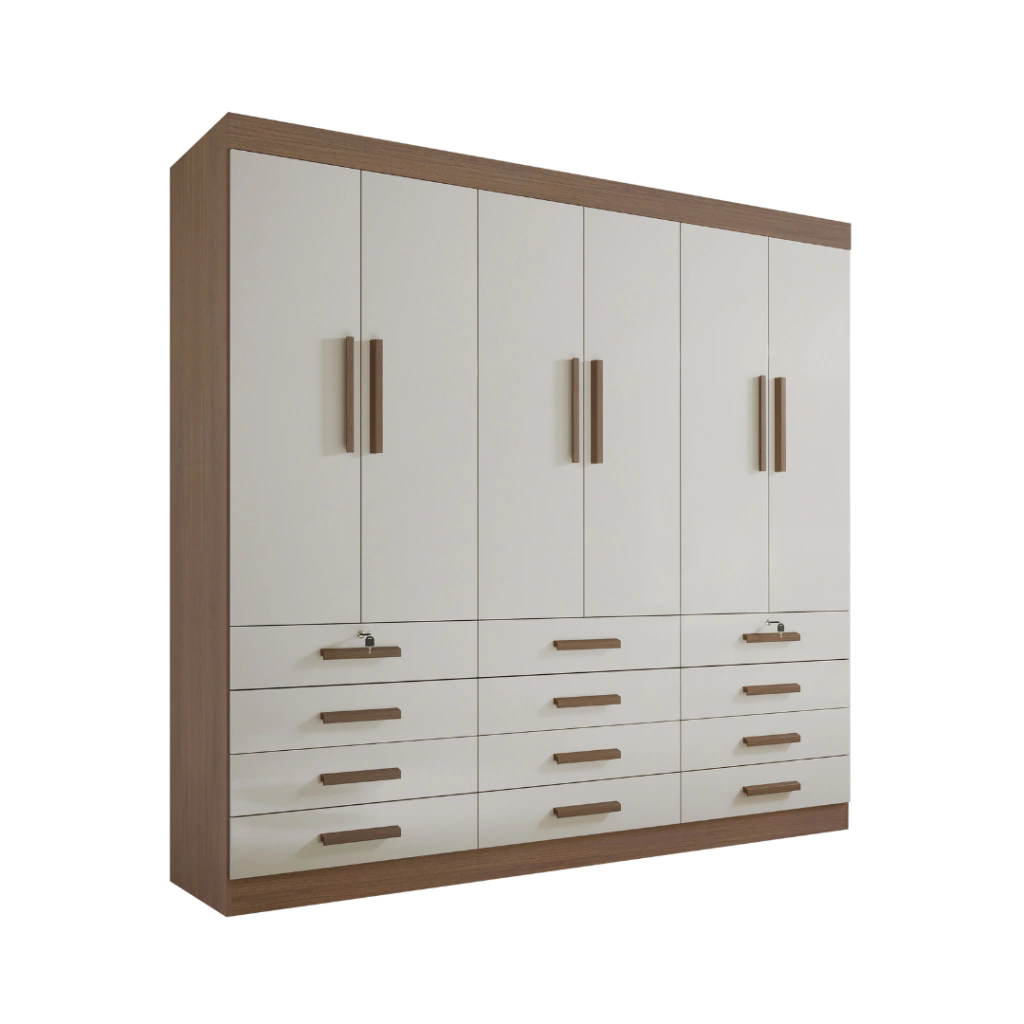 O amplo espaço interno garante organização eficiente, com divisórias bem distribuídas para roupas, calçados e acessórios. Ideal para quartos que exigem praticidade sem abrir mão do estilo.