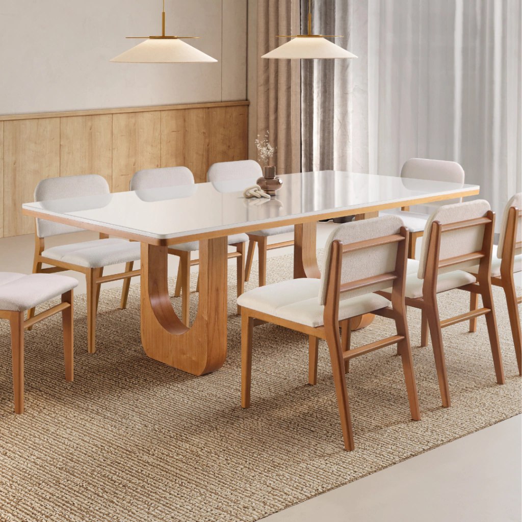 Com design elegante e linhas suaves, a Mesa Ravena é a escolha perfeita para ambientes contemporâneos e sofisticados. Com tampo em MDF revestido com lâminas de madeira sobreposto de vidro laqueado, destaca-se pelo formato curvo dos pés que transmitem leveza e modernidade. Ideal para salas de jantar ou espaços de reunião, combina funcionalidade com estética refinada.